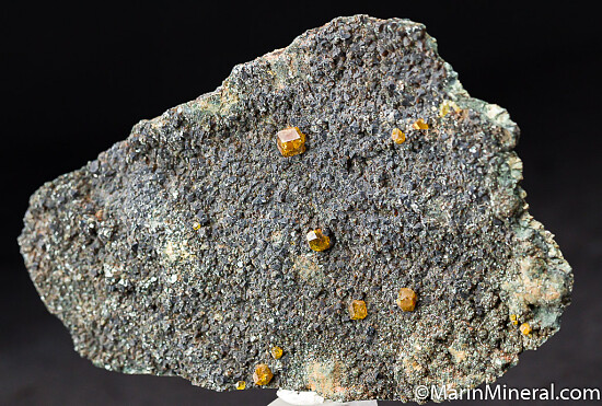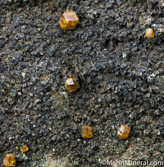 Golden Topazolite crystals on a matrix covered by dark green Clinochlore. Good sharp and glassy crystals to 6mm in size. The Yellow Cat Mine is located near the Benitoite Gem Mine and occassionally produces these fine quality garnets.