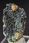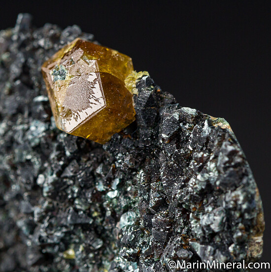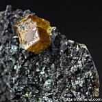 Golden Topazolite crystal on a matrix covered by dark green Clinochlore. A single sharp and glassy crystal 9mm in size. The Yellow Cat Mine is located near the Benitoite Gem Mine and occassionally produces these fine quality garnets.