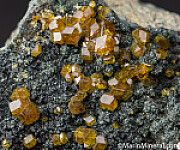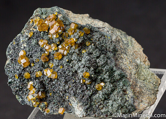 Lustrous golden colored Topazolite crystals and dark green Clinochlore on matrix. The Topazolite crystals reach 4mm and are bright and lustrous. Found near the Benitoite Gem Mine.