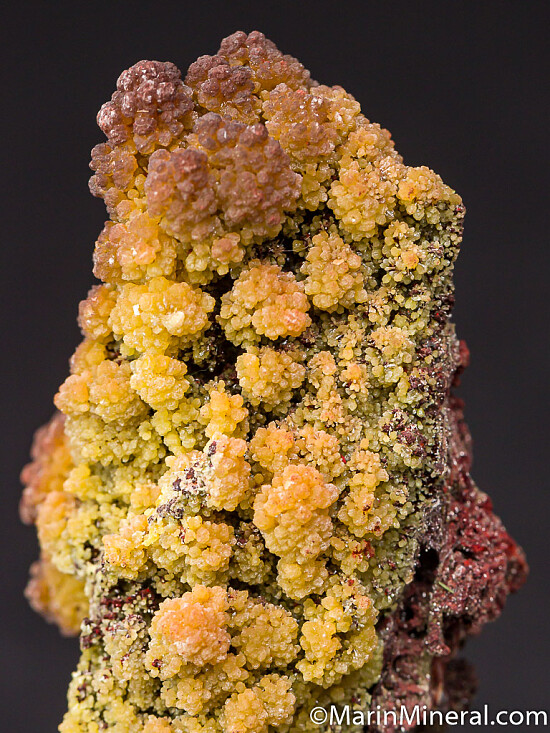 Satiny spheres and botryoidal growths of yellow and yellowbrown Mimetite. Loads of great crystals all over. This is a flaoter specimen fully crystallied on all sides, really nice specimen. Recently mined in 2020 in Santa Eulalia.