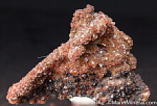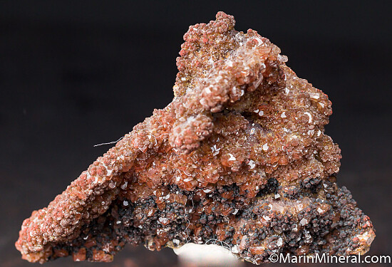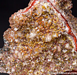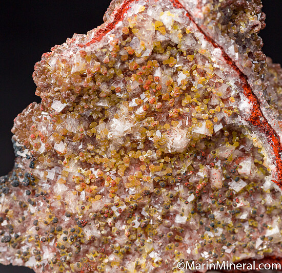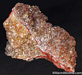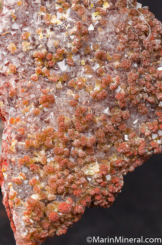 Satiny spheres and botryoidal growths of yellow and reddishbrown Mimetite and clear Calcite crystals on a reddish brown limonite matrix. Loads of great crystals on both sides. The Calcite formed both atop Mimetite and below other generations of Mimetite. Recently mined in 2020 in Santa Eulalia.