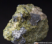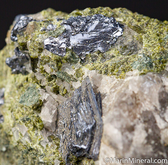 Well formed Molybedenite crystals to 1.5c with nice striations in matrix. The Moore Creek Mine is an old tungsten-molybdenum-copper mine operated in the 1950s and located near the more well known Andradite deposits of Garnet Hill. Collected by Bob Phillips in the 1980s. Ex. Chuck Trantham collection.