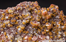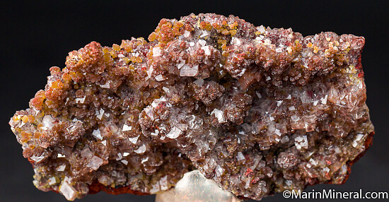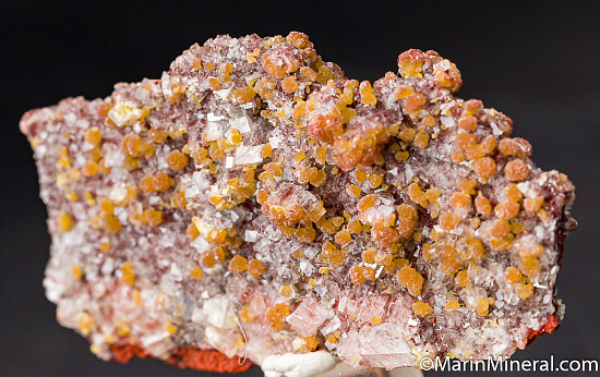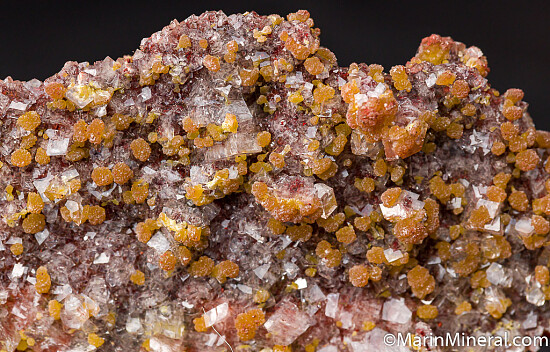 Satiny spheres of yellow Mimetite and clear Calcite crystals on a reddish brown limonite matrix. Loads of great crystals. The Limonite forms a thin, flat plate of matrix wtih good crystals on both sides. Recently mined in 2020 in Santa Eulalia. Valued at $200.