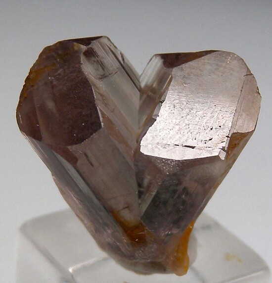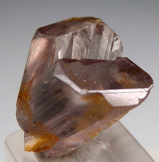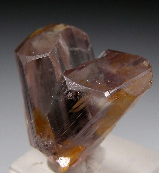 V-twin crystal of color change Diaspore. From new finds in the mountains near Milas, these new Diaspore crystals are spectacular in color and form. Glassy, flat termination faces on both 'arms', complete and undamaged with a point of contact at the bottom of the V where it grew against the matrix. Gem quality and transparent inside. Medium purple color in natural sunlight.
