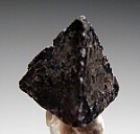 Complete and undamaged tetrahedron of Chambersite, a rare mineral found in salt formations in a small number of localities worldwide. Dark purple in color and collected by Fred Pough in 1970. This a good sized crystal for the species that is complete and and in great condition. Uncommon old crystal out of the Chuck Trantham collection.