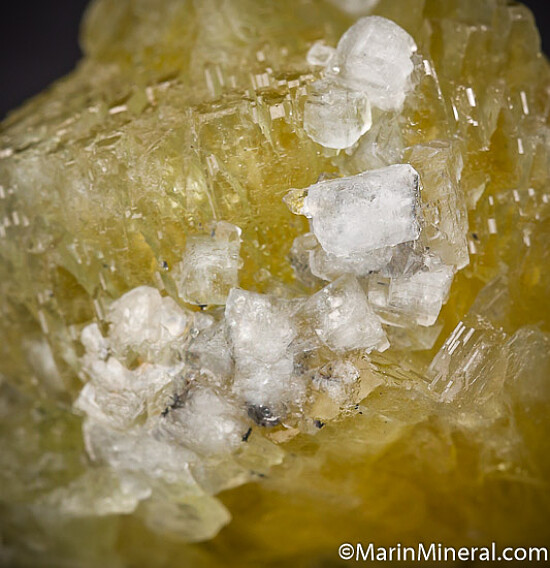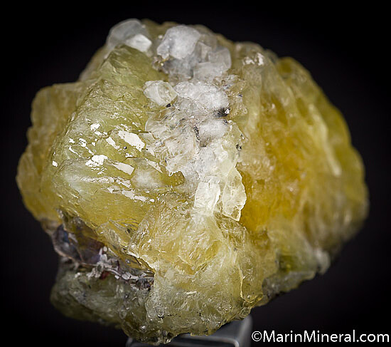 Large translucent crystal groups of yellow Prehnite and associated minerals from the Merelani Tanzanite mines. What a fun piece, it's got a variety of minerals including Graphite on the bottom, an area of gemmy Tanzanite included in one side, and Chabazite crystals along the top. The main focus of course is the large yellow Prehnite crystals, a thick group of large crystals.