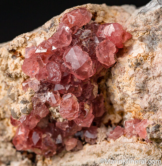 3.5cm wide exposed portion of a vug with translucent pink Rhodochrosite crystals. Good undamaged crystals to 11mm in size.
