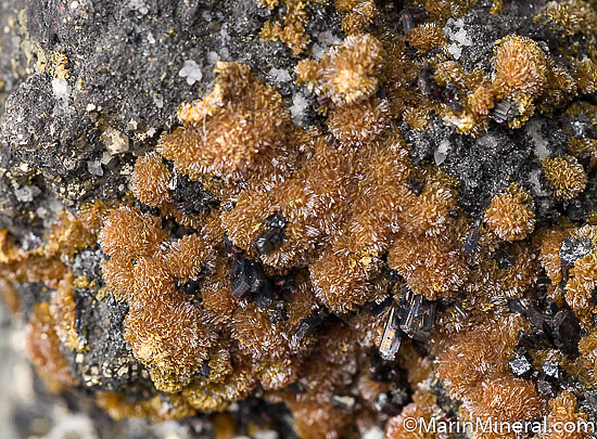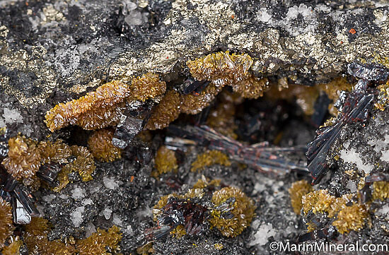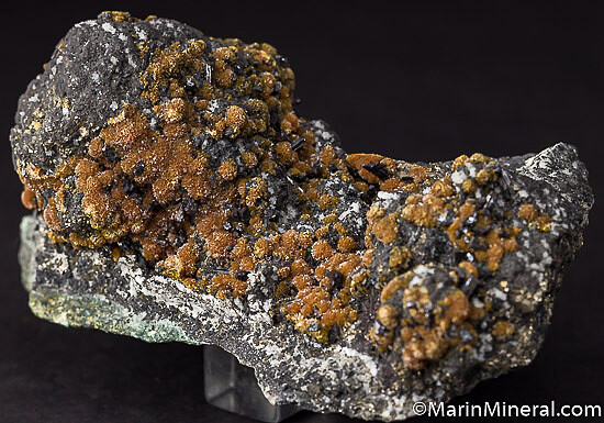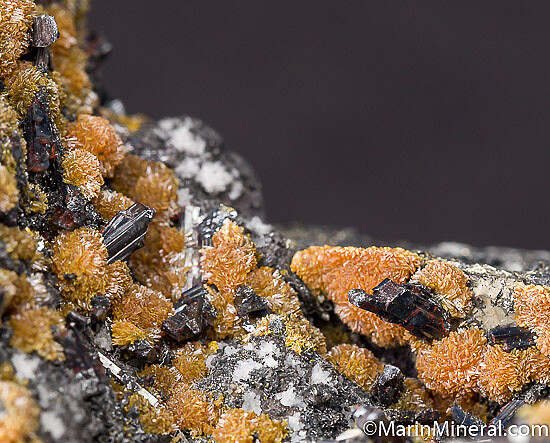 Large sulfide rich matrix with botryoidal Orpiment and red crystals of Hutchinsonite. Hutchinsonite is a rare thallium sulfosalt species and these recently found red crystals are some of the best ever found. Crystals reach over 1cm long and both the Orpiment and Hutchinsonite richly cover the specimen.