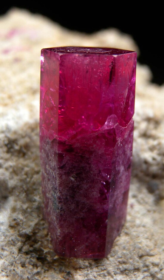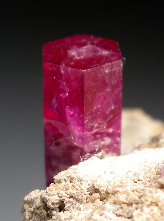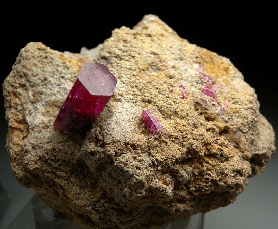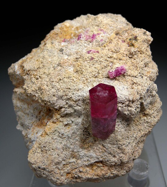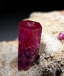 Well terminated 1.8cm Red Beryl crystal on matrix with other smaller crystals. The main crystal on this specimen sticks up off the matrix (most specimens have flat laying crystals) showing off the termination all the way around. Nice and gemmy at the top and undamaged. Ex. Dr. Marvin Rausch collection. Old label indicates it was collected by John Seibel in 1991.