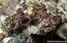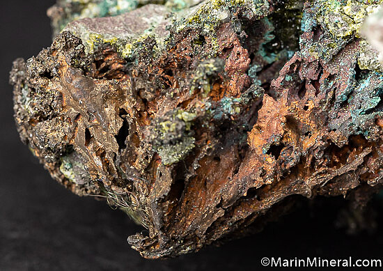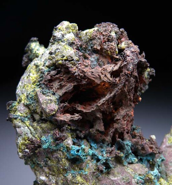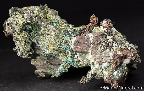 Large specimen with hackly masses of Copper sticking out all over. A very colorful piece with green Epidote, a red rock matrix, and bright Turquoise blue areas. Big, classic Michigan Copper.