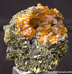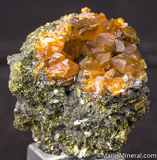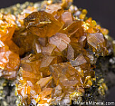 Good crystals of sharp, translucent orange Orpiment crystals atop an Orpiment rich matrix.