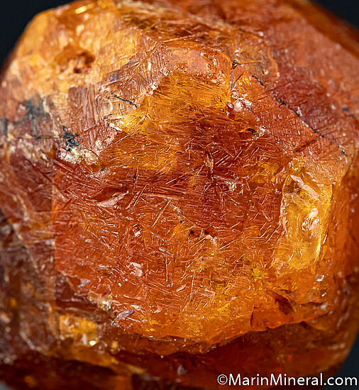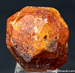 Bright citrus orange Spessartine crystal, complete all around. Equant form with gem zones. There is one minor edge chip and some natural small surface pits, but no significant damage. This is a good one, with minimal black inclusions that negatively affect most of these. The intensity of color and gem zones are even more apparent with backlighting. These are no longer being found. Weighs 26.8 grams.