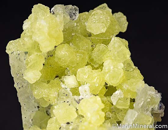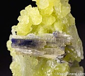 Individual spheres of yellow Prehnite grown in and around flat crystals of white Calcite. This is one of the most beautiful Merelani Prehnites I've ever seen. A fibrous blue Tanzanite and small white crystals (Laumontite?) are attached to the backside. A floater with no points of attachment and little to no damage.