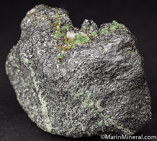 Beautiful and interesting large combination specimen from the Merelani Tanzanite mines. The main focus is a vug on one side containing white Calcite crystals, numerous gemmy green Tsavorites, and Graphite crystals - but the specimen has interesting features all over and is a great study specimen. The matrix is solid Graphite with veins of Pyrite and green Tsavorite running through it. There is a gemmy 7mm blue Tanzanite crystal attached to one side, along with other small vugs filled with Graphite and Tsavorite crystals. A fun one I was tempted to trim down, but decided to leave as it because there was so much going on all over it. Valued at $300-$400.