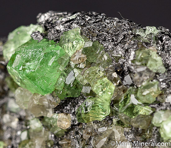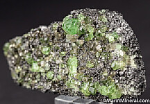 Gemmy Tsavorite crystals to 7mm atop a matrix of Graphite. The crystals are bright and transparent and occur with white Diopside crystals.