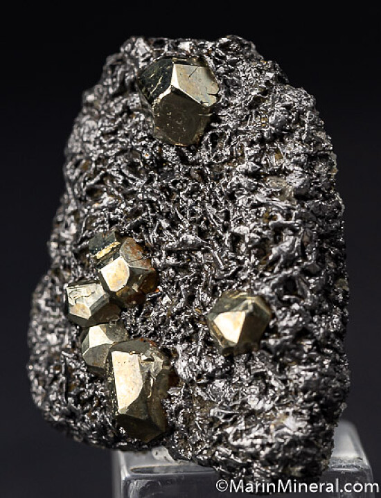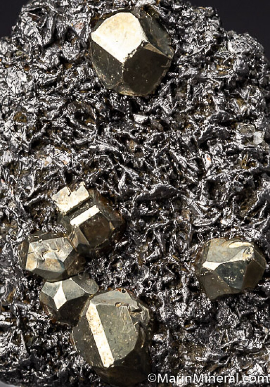 Classic specimen from the Tanzanite mines featuring bright, shiny Pyrite crystals on a matrix of crystallized Graphite.