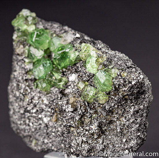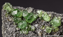 Gemmy Tsavorite crystals on a matrix of solid Graphite. The Tsavorite have good color and transparency and reach 5mm in size. I found 1 small nick on one crystal, otherwise it's undamaged.