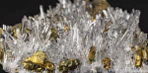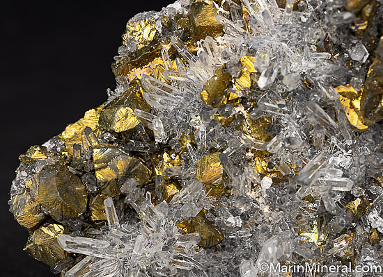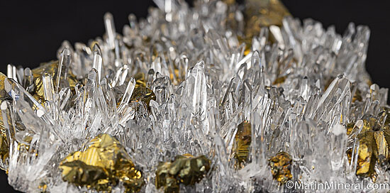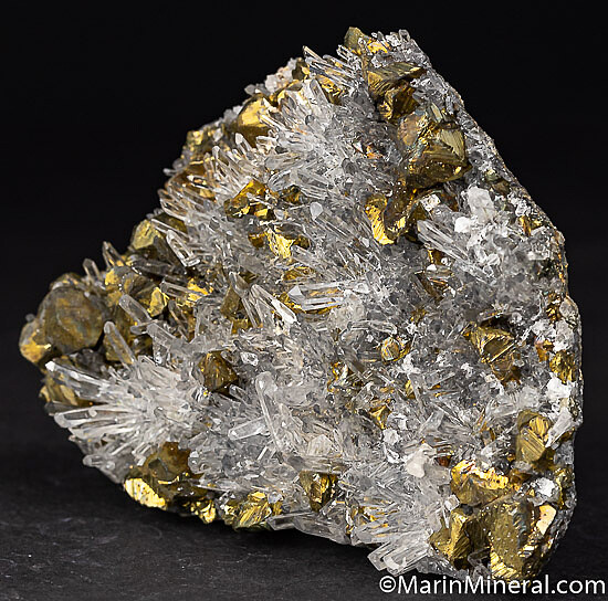 Stunningly attractive specimen of transparent Quartz with bright, brassy Chalcopyrite crystals. These are fairly common minerals, but in a combination and form to produce this beauty. Both minerals are evenly distributed and in good condition with just a few missing Quartz crystals. The Quartz are uniform in size and transparent. An overall very bright and showy specimen.