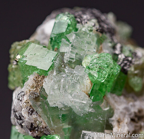 Interesting and colorful combination specimen of Tsavorite and Diopside crystals intergrown iwth platy white Calcite and Graphite.