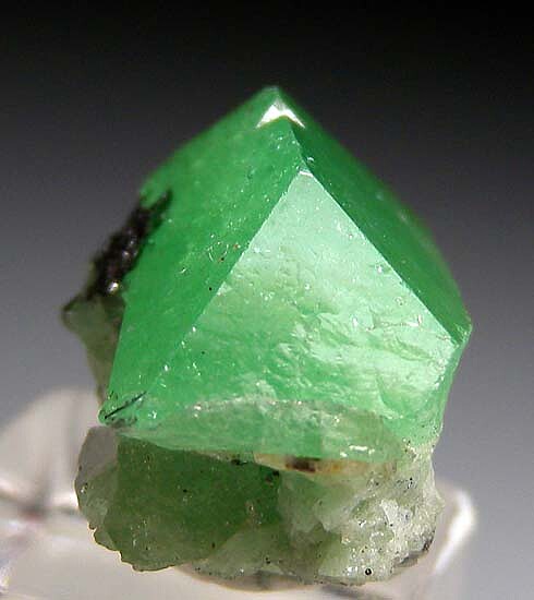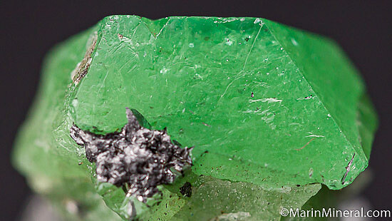 Elongated single Tsavorite crystals with good color. Glassy luster and translucent grading to transparent along the top edge. It's contacted or