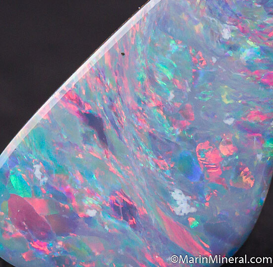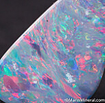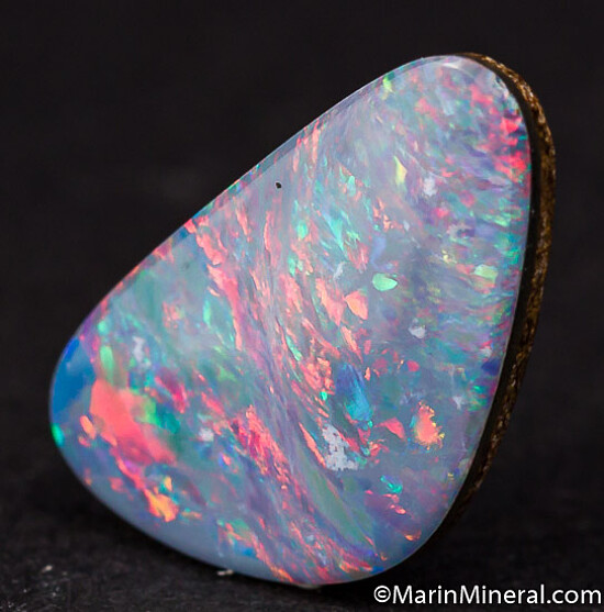 rock backing for stability. Well polished and cut with good blueish body color with flashes of red, green, purple, and blue.