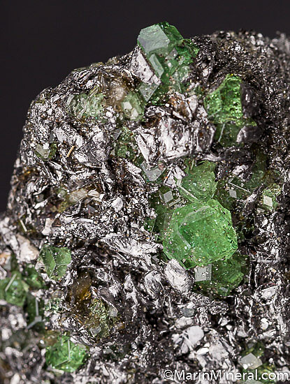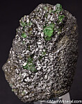 Over a dozen gemmy Tsavorite crystals on Graphite. The crystals have good color, glassy luster, and reach 5mm in size.