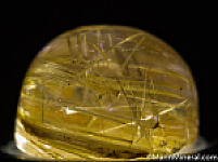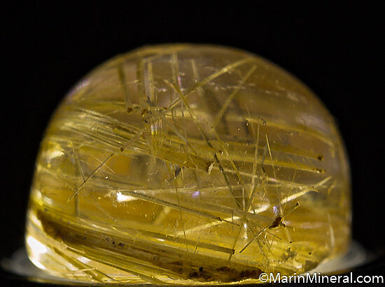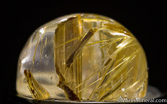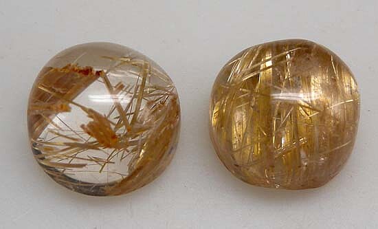Two cabachon gemstones of transparent Quartz included by needles of golden Rutile crystals. Polished on both sides, each approximately 1cm rounds.