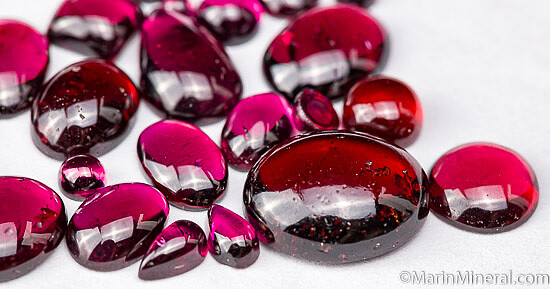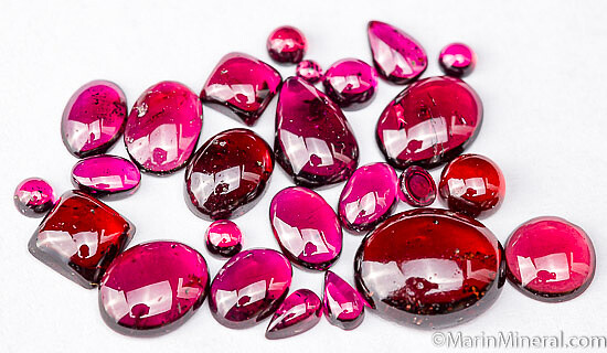 Parcel of 24 red Garnet gemstones. Cabachon gems with a high polish on all sides and good red color. Rounds, ovals, and teardrop shapes, they range in size up to 1.1cm. 22.3 carats total weight.