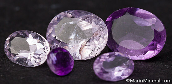 Parcel of amethyst gemstones from Brazil. 5 in all, one rounds and four ovals. They range in size from 3 to 8mm. 4.5 carats total weight.