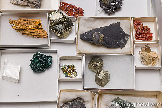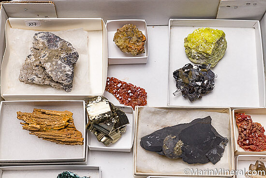 Mixed mineral specimens shown in a 41 x 27cm flat. Included are: Pyrite, Huanzala, Peru; Vanadinite, Morocco; Pyrite, Elba Island, Italy; yellow Fluorite;