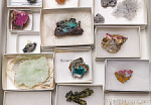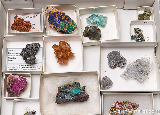 Mixed mineral specimens shown in a 41 x 27cm flat. Included are: Schorl, Erongo Mtns.; Vanadinite, Morocco; Cinnabar, Nevada; Rosasite, Mexico;