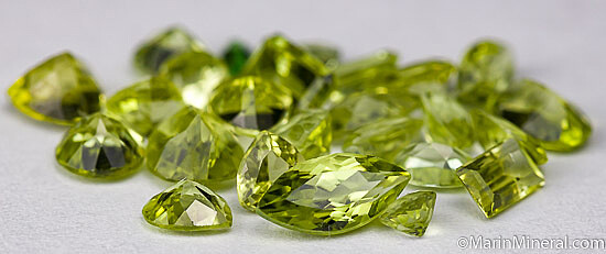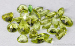 26 Peridot gemstones in various shapes. Largest is a 7mm pear shaped stone. Total weight is 1.66 carats.