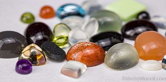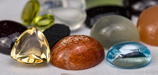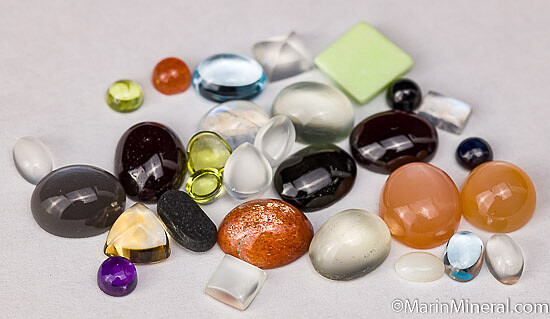 Parcel of 30 cabachon gemstones. There are moonstones, Enstatite with 4-rayed stars, sunstone, Peridot, Amethyst, Aquamarine, Citrine, more. Gemstones up to 10mm in size, total weight of parcel is 37.95 carats.