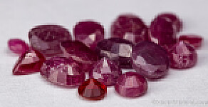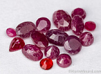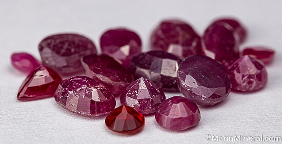 Parcel of 15 red Ruby gemstones. Rounds and oval shapes, they range in size up to 7mm. 7.95 carats total weight. Note that the small bright red round in front is not part of the lot (not a ruby).