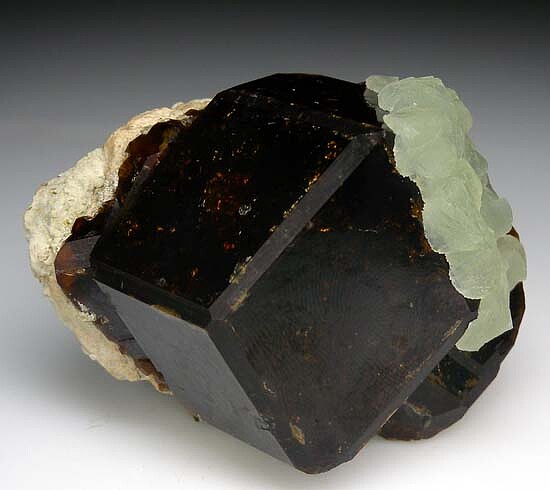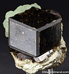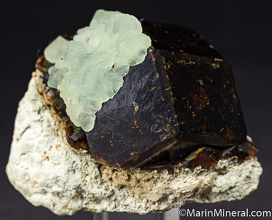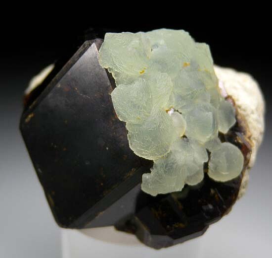 Green Prehnite covering one face of a large, dark brown Andradite crystal. The Andradite is 4.5cm wide. I found one small edge chip, otherwise undamaged. This is an uncommon specimen and I've only seen a couple others like it from this locality with Prehnite on an Andradite crystal.