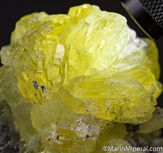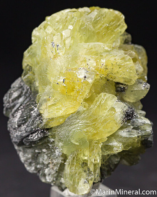 Large translucent Prehnite crystals with strong lemon yellow color from recent finds at Merelani. This is a fantastic example with large crystals all over. It's a floater with crystals on all sides, some intergrown with graphite. It's typical of the recent material from Merelani, already some of the world's best Prehnite before these finds, these new ones are better than previous. There are a couple minor contacts/damage but it's mostly perfect with big crystals all over. Valued at $300-$400.