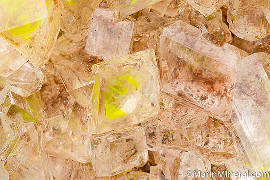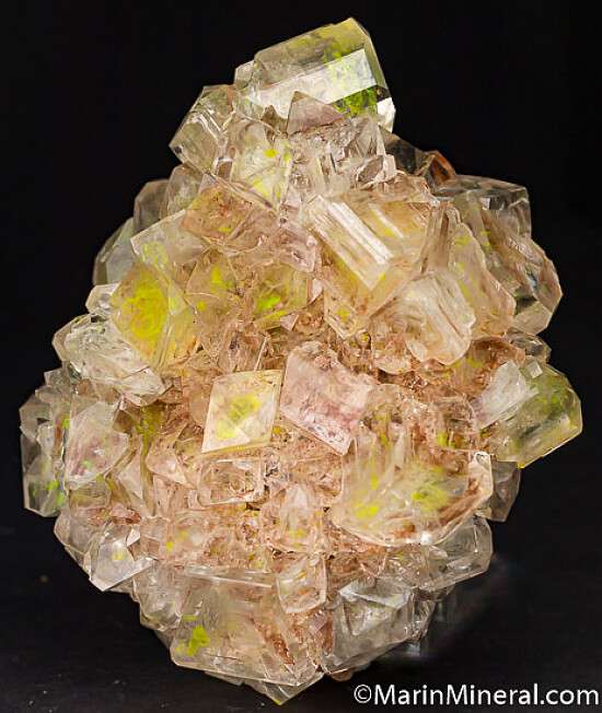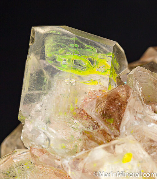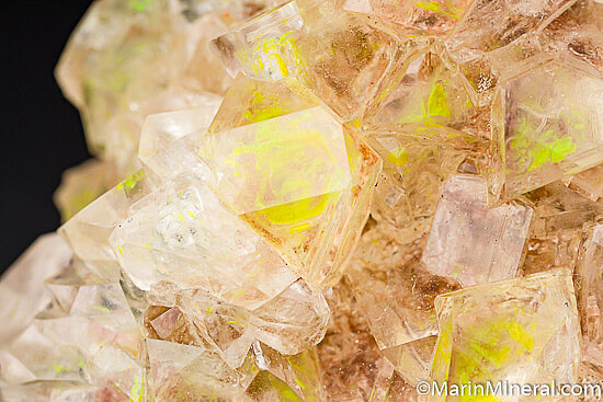 The crystals are transparent with zones of fluorescent yellow/green with individual crystals to 3.5cm. Undmaged and really very attractive.