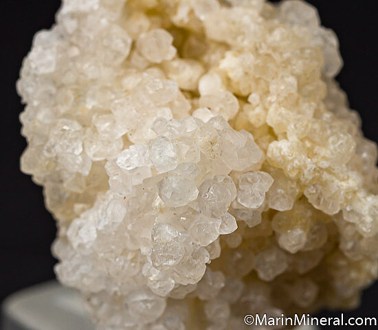 Rare colorless Grossular crystals from a small find made in 2018 near Georgetown. The specimens were found in an approximately 3 meter long lens in Serpentine that was completely mined out. These have been analyzed as nearly pure end member Grossular with the crystals occurring in bunches or on massive white Grossular. 2-3mm crystals. Grossular from this find shows varying degrees of pink/orange fluorescence under long wave ultraviolet light. This deposit is featured in the November-December 2019 Mineralogical Record magazine.