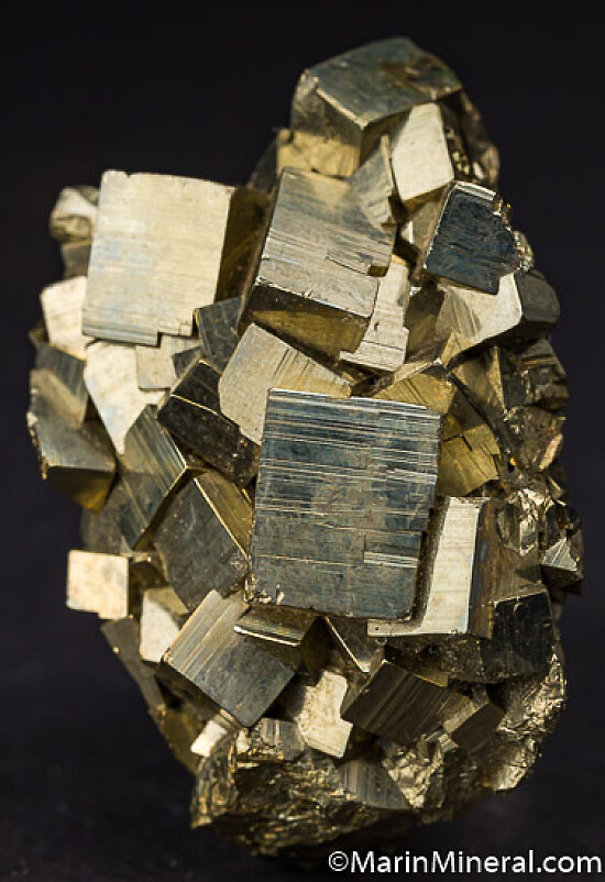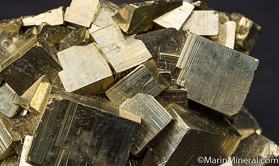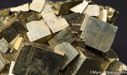 Bright, golden colored cubes of Pyrite. Classic Huanzala Pyrite, a must for any mineral collection. Crystals to 2cm in size.