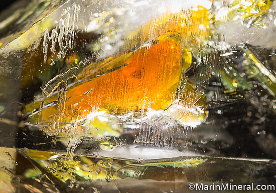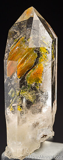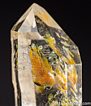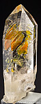 Transparent Quartz crystal with inclusions of orange/yellow petroleum. It has 2 mobing bubbles that travel up to 1cm inside the Quartz. This is unusual as most from this find are double-terminated floaters while this specimen is the only prismatic Quartz of this type I've ever had. Undamaged.