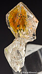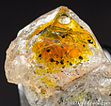 Transparent Quartz crystal with inclusions of orange/yellow petroleum. It has 2 large, moving bubbles (to 4mm) that travel up to 1.2cm inside the Quartz. This has the largest amount of included oil in any Quartz of this type I've ever had. It's contacted on the bottom.