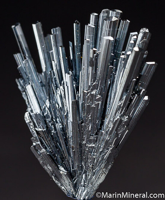 Aesthetic fan-shaped spray of bright, silvery Stbnite crystals.