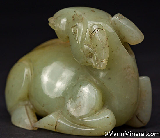 Carving of a ram in light green Nephrite Jade. This was part of a mineral collection I acquired that included a number of old Jade carvings, this is my last one and one of the very best. It does appear to be solid Jade and not soapstone as I could not scratch it with a dental pick.