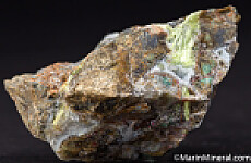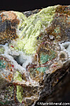 Silica rich matrix hosting crystals of bright yellow Karpatite. The Karpatite is present with drusy Quartz crystals and is exposed in various areas. Karpatite is an uncommon organic mineral, which is also fluorescent. Small red flecks of Cinnabar are also present.