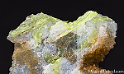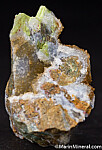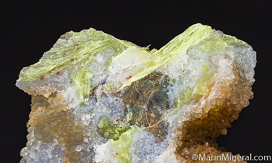 which is also fluorescent. Small red flecks of Cinnabar are also present. The Karpatite is present both beneath the drusy Quartz and