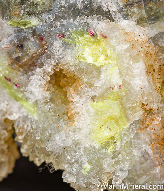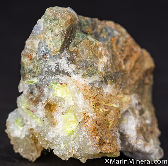 Bright yellow Karpatite crystals (fluorescent) and small flecks of red Cinnabar in crystalline Quartz. Karpatite is a rare organic mineral. These are found near the Benitoite Gem Mine in San Benito Co. California and were rarely seen until a find made by Rick Kennedy about 10 (?) years ago. This specimen is from that find.