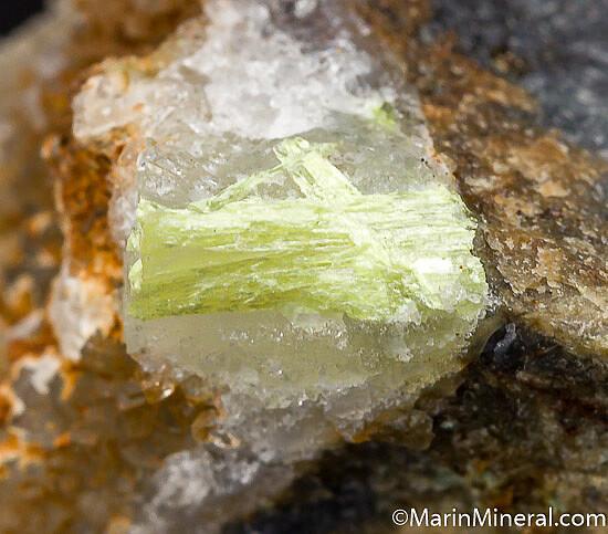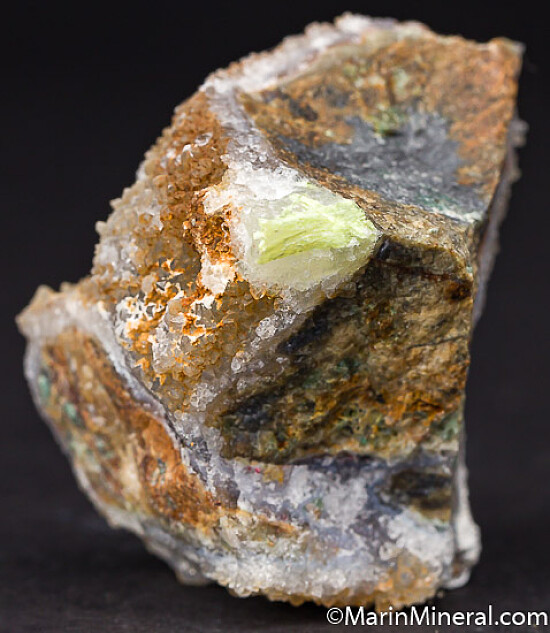 Bright yellow Karpatite crystals (fluorescent) and small flecks of red Cinnabar in crystalline Quartz. Karpatite is a rare organic mineral. These are found near the Benitoite Gem Mine in San Benito Co. California and were rarely seen until a find made by Rick Kennedy about 10 (?) years ago. This specimen is from that find.