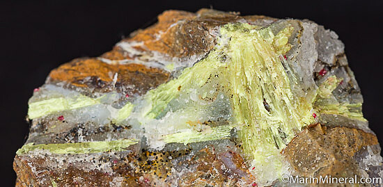 Silica rich matrix with Quartz and numerous areas of bright yellow Karpatite. Karpatite is an uncommon organic mineral, which is also fluorescent. Small red flecks of Cinnabar are also present. The Karpatite is exposed on many areas of the specimen.