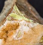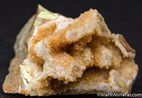 Silica rich matrix hosting drusy Quartz and numerous areas of bright yellow Karpatite. Karpatite is an uncommon organic mineral,