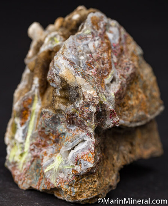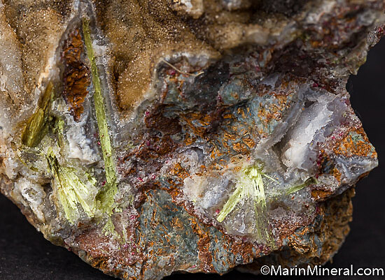 Silica rich matrix hosting drusy Quartz and numerous areas of bright yellow Karpatite. Karpatite is an uncommon organic mineral,